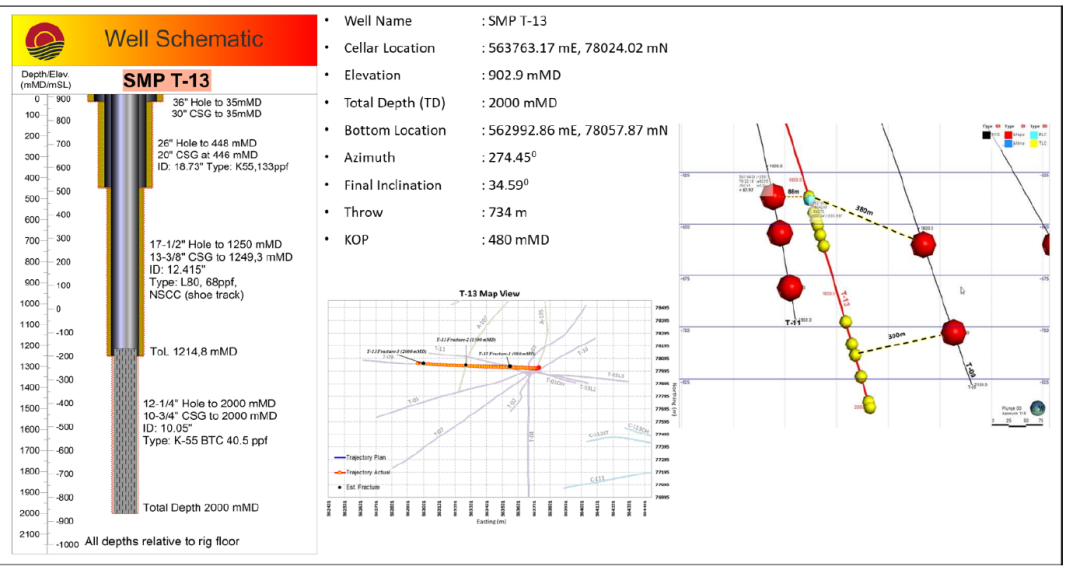2023年6月7日,SMGP鉆井和資源團(tuán)隊(duì)對(duì)耗時(shí)27天、于6月6日完井的T-13井進(jìn)行了完井測(cè)試。測(cè)試數(shù)據(jù)顯示:T-13是一口高溫、高流動(dòng)性的生產(chǎn)井,成功打出了因T-11修井失敗而損失的熱源。該井吸水指數(shù)在54.76kg/s/bar到94.12kg/s/bar之間,在停止注水后4.5小時(shí)后井下最高溫度即錄得217.9℃。其生產(chǎn)層穩(wěn)定在300℃的情況下,該井預(yù)計(jì)可生產(chǎn)190噸/小時(shí)的高壓蒸汽。